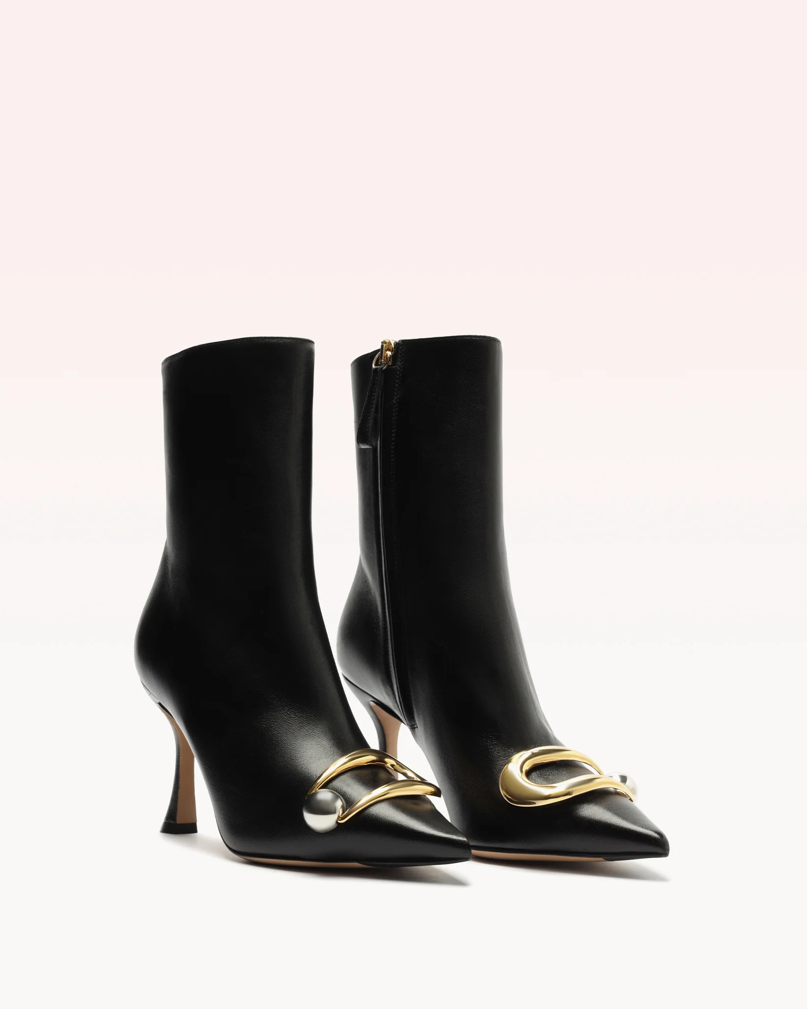 This black ankle boot blends timeless elegance with bold sophistication. Featuring a pointed toe, sculpted stiletto heel, and a luxe gold-tone detail with a pearl accent, itās a must-have statement piece. Ideal for elevating classic looks with modern flair ā a wardrobe essential for fashion-forward styling.
