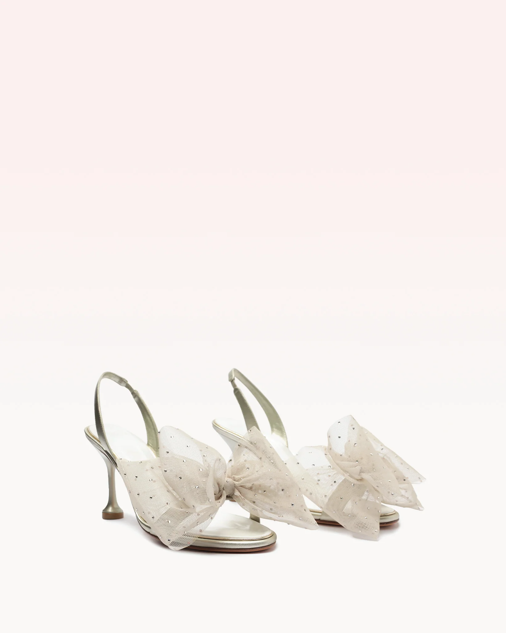 Topped with an oversized tulle rosette, the Isabelle Crystals Bridal heel is a fashion-forward style with statement-making impact. A minimalist slingback strap and our signature flared stiletto heel completes the look of this metallic champagne leather pair.